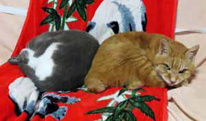最近の茶々は思い切りDORAおばさんに甘ったれていたんだ。本当は私の定位置なのに、ソファではDORAおばさんにベッタリ。上手に食べられなくてご飯を残すと、「まだあるよ」とDORAおばさんが指でお残しを食器の真ん中に寄せて、ソファに上がっちゃった茶々の所に持ってきて食べさせていたんだよ。そうするとまた茶々も食べて、また散らかったのを集めてなんてやっていたんだ。ただ、食べ終わると茶々が苦しそうに咳き込んだりして、気の毒だったんだよ。それでもいつもは治まるとそのまま顔を洗ったり、ソファで寝ていたんだ。ソファにDORAおばさんが、おばあちゃんが使っていたレンジでチンする湯たんぽを温めておいていたから、だいたいそのあたりで寝ていたの。最期の頃はもう、丸まって寝るのは辛いらしくて、たいていライオン座りだったよね。