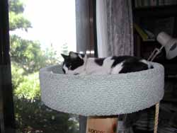 そして3月には今度はクーがケンカ傷で通院。5月6日には我々の結婚25周年と相成った。そして6月の私の誕生日に義弟がネコポールを担いでやって来た。太い丸太部分は歴代猫が爪をといでもまだまだ細くはなっていない。1番下の土台の絨毯こそボロボロだがまだまだ現役、ネコ達が頂上を取り合っている。