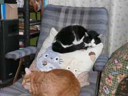 そして私はパソコン操作の初めて物語が続く。デジカメも手に入れた。後ろの籐椅子のクッションではジライヤとクーが一緒に丸まり、クロンはばあちゃんに甘え、みゆはじいちゃんっ子をしていた。