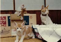 1匹目は高校時代に飼っていたキョンが事故死した後で、当時かかりつけだった井の頭公園の獣医さんに頂いたキジ。生まれて1週間前後の捨て猫で、当時珍しい猫用ミルクと哺乳瓶付きでやって来た。ちょうど高校卒業から大学に入るまでの春休み、箱の中にいす用の電気座布団を入れて、ミルクを飲ませ、お尻を拭いて(子猫はお尻を刺激してやらないと糞尿をしない)面倒を見た。