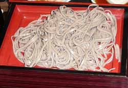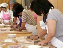 そして次は、昼食前に蕎麦打ち体験。とはいっても時間に限りがあるので、こねてある物をのして切るだけ。こねの失敗はフォローが効かないのである意味合理的かもしれない。説明役の先生の他に何人か手伝いの人が入り、言われたようにのし棒を転がすがこれがなかなかの難物。厚みがまちまちだったり形がいびつになったり、ともかくある程度大きく伸びたところで折りたたんで切る。意外と刃物は左利きの人が居るのにビックリ。何人もで切っていくのが右から左へ同じように動かないのであっちで当たり、こっちで当たり。ともかく蕎麦サイズとはいかなくても皆それぞれのお蕎麦が切れた。これはお土産用で袋に入れて保存剤と一緒に密封してもらう。