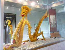 次に向かったのは水引工芸館。入り口で金色の巨大な水引細工の龍が迎えてくれる。まず職人さんが細工を見せながら簡単な解説をしてくれる。その後は美術館へ。花や人形・お神輿などすべて水引細工で出来ている。熨斗袋に付けるような小さなものではなくすべて大作。編み方の上手下手や作品としての向き不向きもあるだろうが、孔雀やお神輿などは細工も細かくすばらしかった。