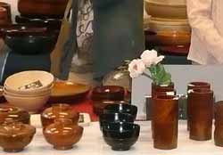 出発は9時。30分ほどで木地師の里。木工業者が集っている一角で、ろくろを使ったコネ鉢やカップなどの他、大きな座卓やタンス・衝立などもあったが値札の桁数を見ただけ。職人さんがろくろを回して実演してくれるだけでなく、仕事をしながらアイデアのある作品の販売トークも滑らかにつむぎだされる。店先では「食べてみて」とお茶と共にジャガイモの煮物や漬物が出される。大物はともかくお孫さんへのおみやげのおもちゃやちょっとした小物など皆さんお買い上げ。