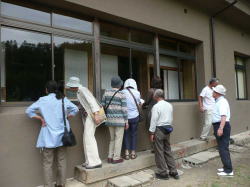地震観測室の置かれている舞鶴山地下壕の方に案内して下さる。ここは大変に地盤が固い所だそうで、戦争当時、天皇・皇后両陛下の御座所を置く予定であったそうで、地上部分の建物、地下壕ともほぼ完成をしていたようだ。現在は研究施設になっているので壕内には入れないが、ひょろ長い廊下のような建物を窓からのぞく事が出来た。壕の入り口も見ることができたが、「他は掘り抜いただけですが、ここは天皇陛下のために内側も厚くコンクリートで塗られています」という事だった。