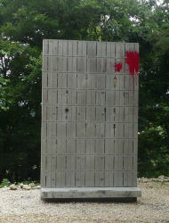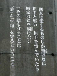 途中の空き地に筆をたくさん挟み込んだオブジェがあった。その裏には『画家は愛する者しか描けない 相手と戦い相手を憎んでいたら画家は絵を描けない 1枚の絵を守る事は「愛」と「平和」を守るという事』と記されていた。