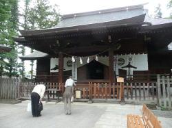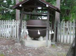 お参りをして象山の像と共に記念写真を撮る。この神社は案内をしてくれた宮坂酒造とも縁が深いようで、酒造用の大釜が奉納されていた。