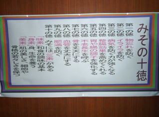 まずは味噌蔵に案内をされてお味噌についての話を聞く。1部屋ありそうな大きな味噌樽がいくつも並べられている。最近は樽を作る職人さんもいなくなり古い物を大切に使っているそうだ。樽のそばには『味噌の十徳』が書かれている。
