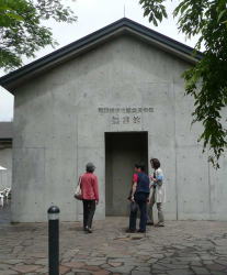 無言館はうっそうとした木立の中、無機質な感じの箱型のコンクリートの建物だった。おもしろい事に料金所は出口にある。