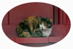 20分ほどバスに乗って次は生島足島神社。緑の中の大きな鳥居やお社の朱が目にまぶしい。子安社に乗っかって三毛猫がのんびりと昼寝をしていた。
