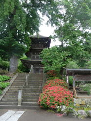 ところが山門を入った途端に雨、大粒で落ちてきたのでそのまま手近の建物に飛び込んだ。売店のおばさんが色々と話しかけてお接待をしてくれたが、時間も押してきたのでそこから「あれだね」と目の前の三重塔を見て、小降りになったところでバスに戻る。途中の売店で山菜のコシアブラを見つけて買い込んだが。