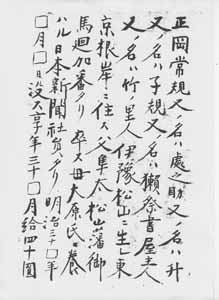 また、子規の記念館を先生が見に行った話もあり、同じ所には台東区立書道博物館があり、その中に同時代の中村不折の記念室もあるので、ともに見ると良いとの事だった。ところで子規の墓碑銘は本人が生前に書いたものだそうで、拓本をみんなに配ってくれた。亡くなるのが何時かなど空けてあるが、月給の額まで入っていて、当時すでに結核で自宅で臥せっていてそこから原稿を送るような生活だったそうだが、明治29年に月給で40円ほどもらっていたそうである。現在に直すとどの位だろうと話が出たが、それで本人と母・妹の生活をまかなっていたそうである。享年は35歳だそうだが、教科書の写真などで覚えている子規はずいぶんおじさんくさい印象で、改めて若かったのだなと思った。