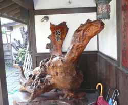 火星先生のお宅はこのあたりなんだろうな、猫達は元気だろうかと窓の外を漠然と眺めている内にバスは丸岡ICから高速へ。次の福井北ICで降りて九頭竜川をさかのぼって行く。次の目的地は福井県立恐竜博物館だが途中の羽二重餅の古里織福という土産物屋さんでトイレ休憩。すでに恐竜が売りのようで大きな木の根の恐竜?の置物が入口にあった。懲りたのかしつけのためか、『お行儀の悪いお子さん入店お断り』の立て札も。