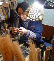 食後は工房の見学。さまざまな種類の竹、さらには育つ途中で板で形を作って平たく育てた竹、雷にあって稲妻の通った黒い部分がある竹などがあった。糸のように細いヒゴを割りながら職人さんが説明をしてくれたが、竹と言ってもただ割ってはまっすぐに割けないので微妙に刃の調節をしながら割っている事、人形の頭を作るためには1本の竹から削りだしたり、何枚かの竹の板を貼り合わせて厚みを出してから削り出すなどいくつかの方法がある事、また胴体にしてもそのまま作りだしたり、太さの違う竹を順にはめていくなど色々な方法がある事などを説明してくれた。