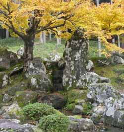 道路と川を渡って丘を登るとそこが朝倉館。麓に最後の城主・景綱の墓がある。そこを登って行くといくつかの館の礎石があり、それぞれに庭があったようで庭石の配置がされて図面の説明もあった。
