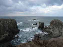20分も走ると東尋坊。バスから降りるとさすがに風が冷たい。土産物屋さんの店の中経由で海岸へ出る。周遊コースもあるが、皆の足は海へ、千畳敷の方へ。蒼い海と輝石安山岩という岩の柱状節理は荒々しい魅力がある。それぞれに三々五々歩き、最後に看板の前で写真を撮って戻って来たはずだが1人居なくなった…。皆集合時間は分かっていたはずなのだが…。土産物屋さんで時間を食っていたようだが、1人帰って来なくて10分遅れは我々の旅では珍しかった。