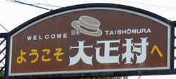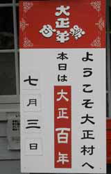 先の通りを渡ると大正村役場。木造2階建で水色のペンキ塗りが可愛らしい。入口には今年は大正100年だそうで看板が出ていた。