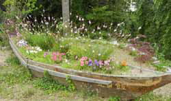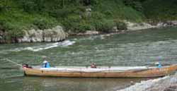 梅雨時のため、雨よけのビニールとそれを安定させる針金、さらに船端にある座布団のようなものは浮だそうだ。奥から順に詰めて乗っていく。我々以外の乗客はご夫婦らしい2人連れだけだった。実はこの便は電車とのリンクがされてなくて乗り継ぎが不便で観光バスで来る団体さんが多いらしい。11時45分の出港。前の船頭さんがさおを操り後ろの方が機械の番、さらに真ん中にはガイドさんが乗って案内をしてくれる。舟としては何の飾りけもない小舟だが、安定して進めるためには発動機が必要だそうだ。