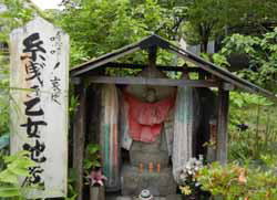 食後は浪漫館の前でガイドさんと待ち合わせ。大正村の絵地図を渡されていざ出発。まずは大正路地へ。石畳の狭い道の片側には大きな蔵が並ぶ。板壁のようだが、その中は土壁で火事の時には止めてある板をはがしてしまえば燃え広がらない作りだそうだ。路地の入口の小川のほとりには糸曳き乙女地蔵が祭られており、山村から連れて来られた女工さん達の哀史を伝えている。