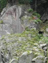 幸い時々お日様も顔を出し風も穏やかで両岸の岩の色と木々の緑、天竜さつきだという赤い花、さらに時々白く光る葉はマタタビの葉だそうだ。ビューポイントの案内の他に、スタート直後には写真撮影(1枚\1500)があり販売トーク、ついでに他の写真やおみやげの檜笠煎餅も。このお煎餅はお味見に1つずつ頂いた。