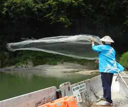 さらに進むと船頭さんが投網を披露。8月からは魚がかかれば焼いて食べるそうだが、7月はまだ禁漁。そのためかどうか2度網を投げてくれてともにボウズだった。