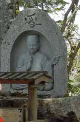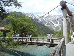 明神橋で記念写真、そこを渡ったところにある明神池は奥穂高神社奥宮のご神体のような形になっている。入場料\300で中を散策できるようだが、他の2人とともに入り口で一休みを選択、緑色の池を垣間見た。その手前には穂高の案内人としてこの地に1番早く小屋を建てた上條嘉門次(1847〜1917)の小屋が今も続いており、記念碑も建てられていた。