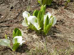 山を堪能した後は土産物屋経由で外へ。千石園地はまだ雪に覆われ、通路の雪だけかき除けられていた。水芭蕉がきれいだった。また槍ヶ岳を開山(初登頂)した播隆上人の像があった。雪が珍しい我々、おじさん・おばさんがついはしゃいで雪投げをしたり…。
