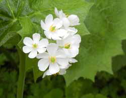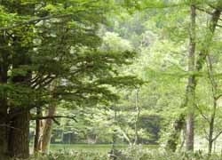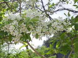 食後はガイドさんの先導で明神池まで片道1時間の散策。丁度ウワミズザクラが満開でイチリンソウやニリンソウなどの白い花々がきれいだった。ヤブレガサやハシリドコロ、スミレ、サクラソウっぽい白い花など他にも名前の分からない色々な花が咲いていた。