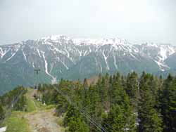 第1ロープウェイはここから鍋平駅まで、ここで1度駅を出てしらかば平駅から第2ロープウェイで西穂高口駅まで登る。この第2ロープウェイは2階建てになっている。2階部分に乗ったが、ふもとは初夏の景色だが、途中は芽吹きだしたばかりの木々の葉の柔らかな色が広がり、登るにつれて周りの山々が大きくなってくる。足元の白樺はこれから芽を伸ばそうという様。