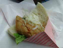 12時半には日本海が見えてきた。みんな海が気になるのだろう、路肩に「わき見運転禁止」と大書きしてあった。米山SAで一休み。少しは足を動かして体をほぐしたいのだが、寒い!!ここの名物だというサバサンドを食べた。パンにサバのから揚げと玉ねぎが挟んであるのだが、繁盛しているのだから熱々のから揚げで食べたかった。