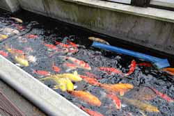湯沢ICで1度高速を降り、近くにあるレストハウス越後(錦鯉ランド)で昼食。少し時間が押し気味になってしまい、幹事さんはハラハラしていたようだ。とうとう雨になったが、傘をさす間もなくレストハウスへ。入り口前の流れの中でたくさんの巨大な錦鯉が迎えてくれた。
