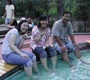 次はここに着くまでに迷い込んだ穂高町健康温泉館前にある足湯に行く。丸い湯を囲んでベンチがある。中心には色々な表情の8面の顔。民話の八面大王がモチーフになっているそうだ。ぱろぱろさんは靴下が脱げなくて入れなかったが、後の4人で湯に浸かる。湯の中はこれも流行りの石が埋められて足のツボ刺激が出来るようになっている。けっこう痛い!
