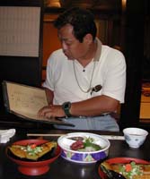 はじめは食べるのに忙しい。魚介のお刺身・鹿のお刺身・なます・えびの焼き物・キノコの寄せ物・角煮・てんぷら・茶碗蒸・小魚のから揚げ・餃子・イカ焼きetc。ストーブ屋さんが交渉してみると言っていたマツタケもお吸い物になって出てきた。皆が忙しく食べている間に風さんが皆の紹介をしてくれる。