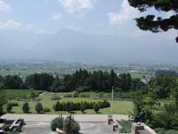 「それなら昨日見たドライブインへ。多分豊科から大町までのどこかにある。」というわけでせっせと安曇野へ逆戻り。まだ時間も早いしどうせ明日も休み、心の余裕は十分ある。今度はR19をたどる。そろそろ昼というところで池田の道の駅あたり。せっかくだから池田町立美術館へ。看板の斜め加減にだまされて、前の車に続いて入った道は住宅地へ入る道。その前を行く自転車も含めてみんなで元の道から入りなおして、山に登っていく。高台から町が一望でき、その向こうは北アルプスの山々、ハーブの花壇の良い匂いも立ち込めて、ちょっと十勝池田のワイン城を思わせる。
