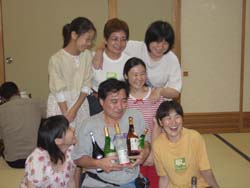 どうせ長くなると思ったのか宿の人達は最後の味噌汁を出して帰ってしまったらしい。そこで内緒内緒で持ち込んだTANUKIの酒とサカナ登場。釜揚げの桜海老はそのまま、マグロはおもむろに包丁を出して切り始める。さらに今回は来られなかったじゃけんのうさんがこの会のために送ってくれたお酒、今回の最年長の津波さんが幸せいっぱい全部の酒瓶を抱きしめ、ありあわせの美女?を回りに侍らせてカメラに収まる。何故かどんちゃん1人スタジオAさんとさしで飲み比べ。この勝負は翌朝ケロリとしていたどんちゃんの勝ち!。(スタジオAさんの名誉のために、どんちゃんはビール党、スタジオAさんは日本酒党である事を加えます)