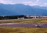 ごくシンプルな作りの空港をひとまわりして1つしかない小さな食堂へ。千歳行きが立つ前で立て込んでいる。しばらく向かいの売店で時間をつぶし、ともかくお昼。TANUKIは蕎麦、DORAはホットドック。軽いのであっという間に食べ終わり、カンカンと暑い中¥100也の送迎デッキへ出てみる。先客の家族連れが暑い中でお弁当を食べている。セスナ機が1機、駐機場に止まっているだけの滑走路。山並みがかすみまわりの緑が目に鮮やかである。でも暑い!しばらくして新しいセスナが駐機場に入り飛び立って行った。
