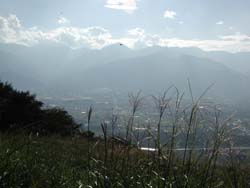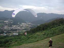 さて、パラグライダーのグループはストーブ屋さんとはお知り合い。せっかくだからと2人の方がデモフライトをしてくれた。気流が良くて上手な人ならこの出発点よりも高く上がって同じ場所に着地できるそうだが、すでに夕方で空気の流れが良くないので下に下りるそうだ。それでも思ったよりもゆったりと空の上を楽しめるように見える。