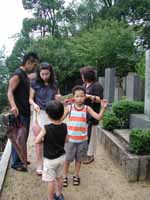 降りたところでお墓掃除には不向きな按配。足元の草むらで小さなバッタがピョンピョンしているので子供達を呼ぶと、セリ君家の子供達は平気で捕まえるがショーゴ君はちょっぴり苦手そう。