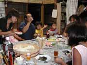 お祭りの後はお直会。皆でイスを片付けて隅に積んであるテーブルを広げ料理を並べる。今回はもうじき結婚するというセイジ君の彼女も手伝いに来てくれていた。