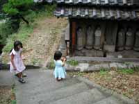 後片付けの後、子供達を連れてそれぞれに遊んだ思い出の残る裏の山に登る。立派に石段ができている!ずっと雨降りだったのでカタツムリがたくさんいて子供達はそれを捕まえながら登っている。途中にお地蔵様を祭った祠があり、小高い頂上には厄神社がある。薄田泣菫の立派な詩碑は初めて見た。ただし、私が前回ここまで来たのはヒサママがその長女のモモちゃんよりちょっと小さい位の頃だと思う。