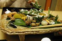 次に出てきたお椀は季節柄かぶら蒸し。仲居さんが懇切にお料理や材料の説明をしてくれる。お刺身に天ぷら、そろそろお酒がなくなる頃合には「次はいかがしましょう」と若い衆が聞きに来る。そして野菜の炊き合わせ。一口ずつ出てきているのだが、この辺りでお腹が一杯になってくる。最後にハスとサツマイモを炊き込んだご飯とお漬物、そして熱いお蕎麦。デザートは自家製のゴマのジェラードとリンゴのジェラード。柿もついて豪華版だった。