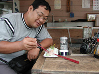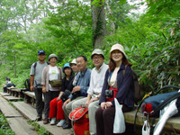 「上は涼しい」「昨日は寒かった」という話で、温泉はやめて、鳩待峠まで上がって待つ事にし支度。am9:45お客さんの数が纏って出発。20分程で鳩待峠へ。しばらくのんびりして、売店を見たりした後、売店の前で焼いている岩魚の匂いに釣られてそちらへ。TANUKIは刺身、私は塩焼きを頼んで、これから歩く事を考えて缶ビールは半分こ。お店の人や相客の人達とおしゃべりをしながら仲間を待った。am11:40、予定通り待ち人到着。風さんがバスの窓から見つけて手を振ってくれた。ここからのメンバーは、企画案内人のスタジオAさん、風さん、○さん、ままねこさん、ぱろぱろさん&チロちゃん親子そして我々の計8名。