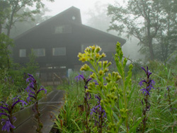 朝靄の中で/風さん撮影 翌25日、「何時かしら」と言うくりさんの声で、皆目覚め始める。am5:25。「良く寝たね」「山小屋で寝ているのを忘れていた」等々、おしゃべりをしながら朝の支度。am6:00には朝食の案内。夕べのはまちゃんのお漬物も加えて、しっかりと朝ご飯を食べる。ついでながら、男性陣は自分達のご飯を食べ尽くして、女性のお櫃までご飯を取りに来た。後から来た相席の方がご飯が無いのにビックリされていた。