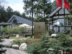た明るい庭に2棟の瀟洒な建物が建っている。一方がcafe安曇野文庫、もう一方がロイヤルコペンハーゲンのお皿などを中心にコレクションしている大熊美術館である。