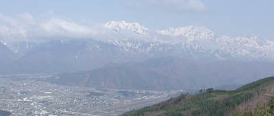 Strixさんお薦めの早朝から遅れる事2時間位か…。am8:20頂上着。先客の青年がちょうど写真を撮り終えたのか三脚をかついで引き上げて行くのとすれちがった。他は誰もいない。目の前には北アルプスの山々。眼下に町と水の入った田が日の光に輝いて見える。まるで山々にそっと抱えられているようだ。