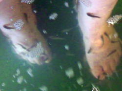 午後はそれぞれに別メニューの予定。TANUKIはまだ岩盤浴。TOPPOさんはバリ式マッサージがお気に入り。私はアカスリ。その前に、水槽に小魚がたくさん入っていて足を入れるとつついてくれるというのが面白そうで、TOPPOさんと2人で試してみる。10分間500円。なかなか面白い体験だった。