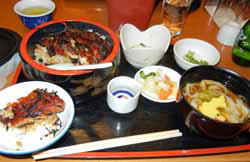 その後は名古屋城の前の店で昼食。こちらも前回同様ひつまぶし。名古屋名物きしめんまで付いて、かなりお腹にたまったのでお茶漬けは最後の1杯だけにしておいた。