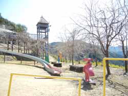 ここまで来ると意地になり、次の道にチャレンジ。これまた同じような道で、対向車には会いたくない道だが、こちらは2つの看板の案内で何とかたどり着いた。しかし、この公園が行きどまり。もちろん誰もいない。10台分位の駐車スペースの脇に三椏と水仙が満開だった。もっと広いのだが、とりあえず上り下りを歩きたくなくて見晴らしの良さそうな方に行く。下の千頭駅周辺がジオラマのように見えて、なかなか絶景だった。しかし、周りのオブジェは下の音戯の郷とタイアップされてた音をテーマとしているようなのだが、大型のプラスチックのおもちゃのようで、不思議なものだった。