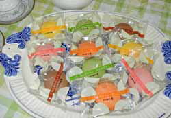 その後、静岡に用事ができたついでにデパートに寄って売り場で見たのは記憶にある華やかな色どりのものだった。(2)これもせっかくなのでお味見にいくつか買ってみた。こちらは正統派のパリッとした洋風最中皮にジャムフィリング。皮にも何か入れてあるものもあって、香がわりと強かった。思いは同じだったらしく、TOPPOさんも「別のを買ってみた」と写真を送ってくれた。ピンクのが悶絶するほど甘かったそうだが、それぞれに香りが良かったそうだ。初めにおみやげで頂いたものは常温保存だったが、これらは要冷蔵。賞味期限の短いのでTOPPOさんには大変だったようだ。