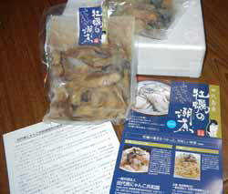 牡蠣は地元の漁師さん達の保存法らしい潮煮2袋の冷凍で来た。まるまるぷっくりとした牡蠣を食べるのを楽しみにしている。