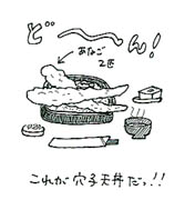 並ぶのが大嫌いな3匹、内2匹がお店が満席で文句もなく並ぶ。穴子丼のすごさを知らない、しかも奢らされる事になっているTANUKIはブツブツ。しかし、お客の列が長くなったためか昼間は使っていないカラオケルームへ案内されて穴子丼とご対面。
